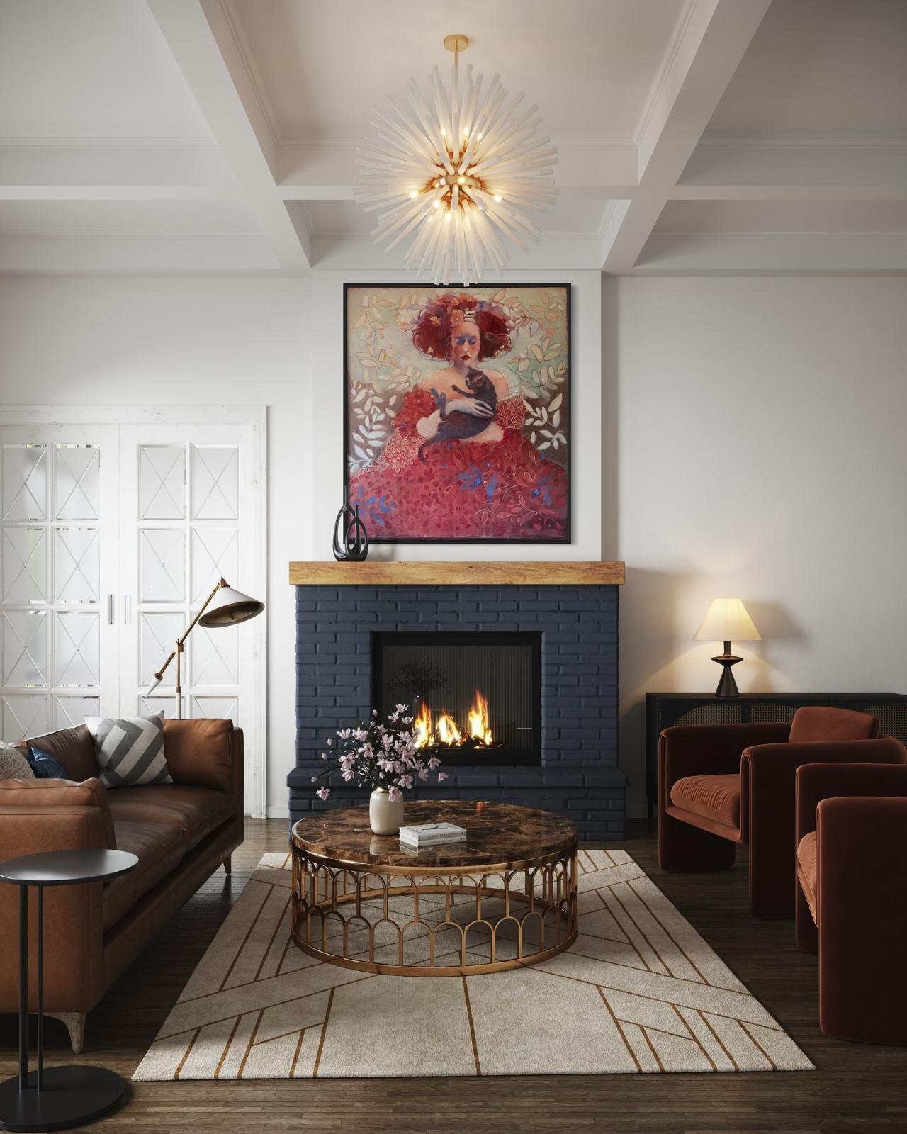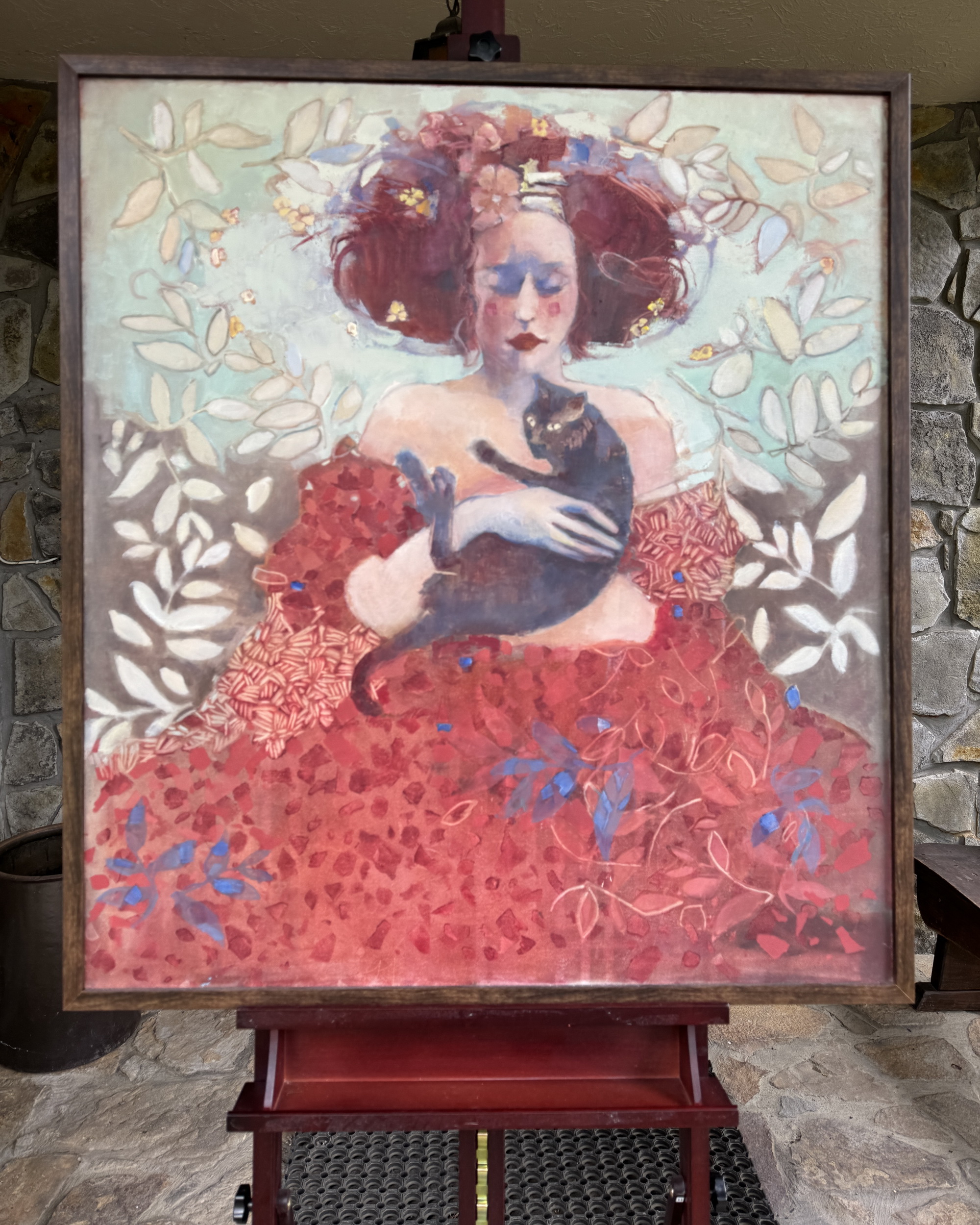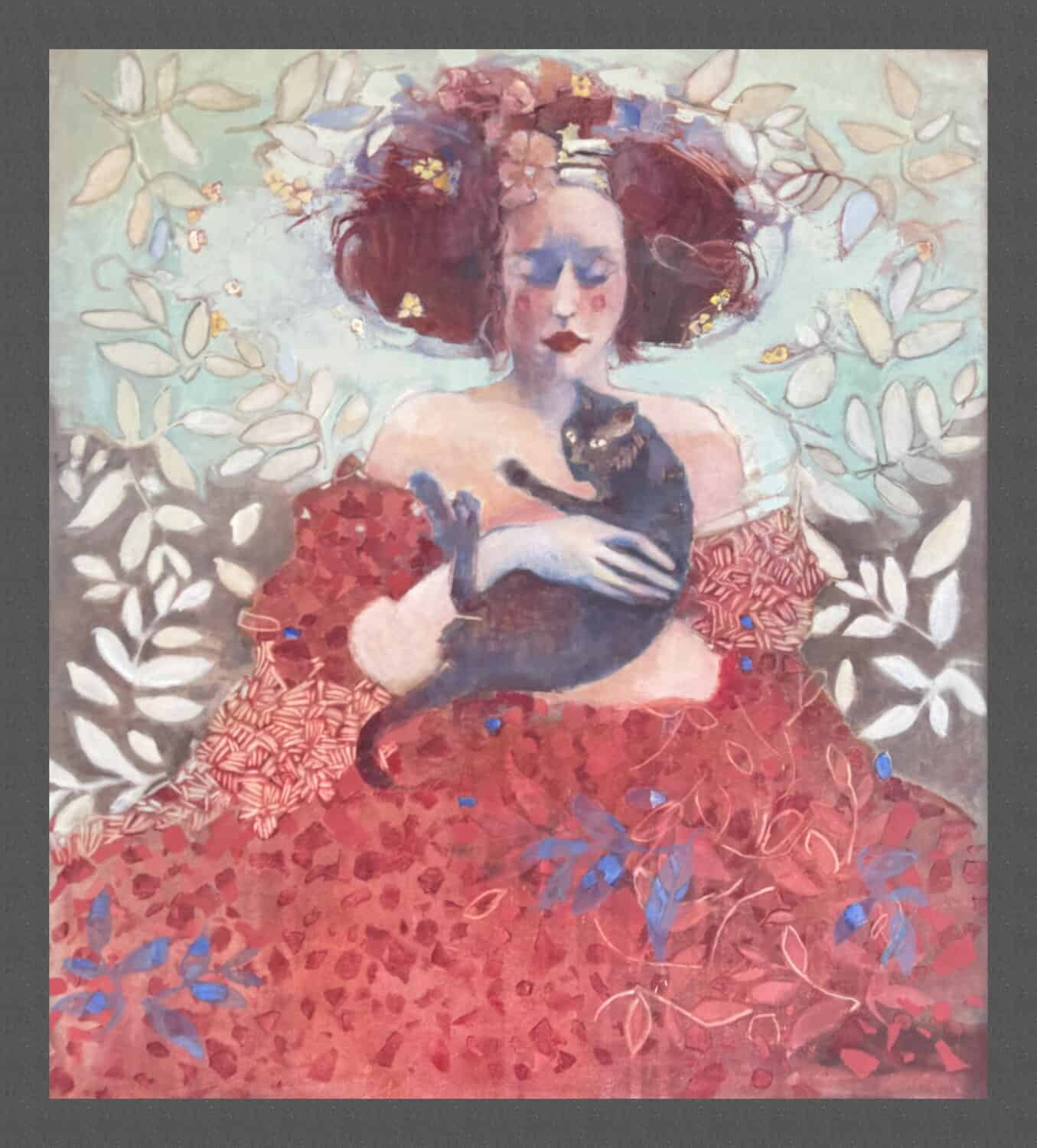 Młoda dziewczyna tuli w ramionach kota – jakby własne dziecko. W jej spojrzeniu kryje się czułość i gotowość do poświęceń. Bogato zdobiona suknia i liściaste ornamenty tła nadają scenie teatralny, niemal przerysowany charakter, na obrazie najprawdziwsza jest tylko emocja młodej damy i skrępowany tą sytuacją kot. To obraz o potrzebie opieki – bez względu na wszystko i często mimo woli .