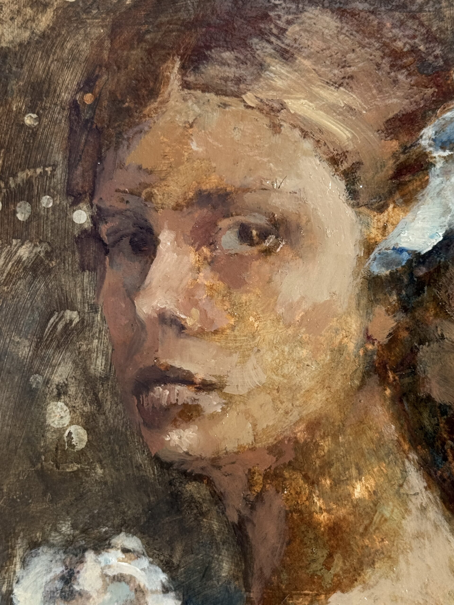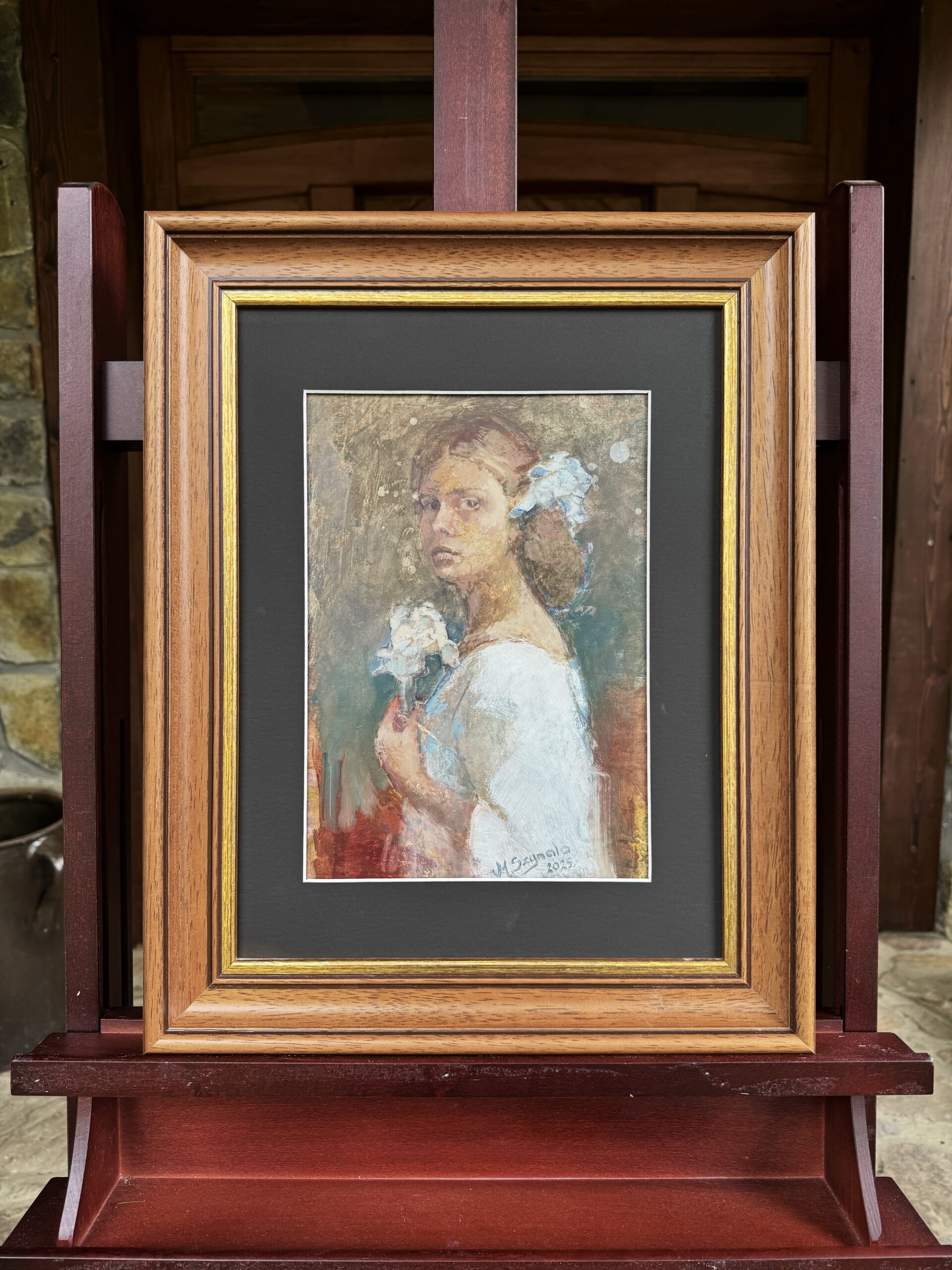 Na obrazie widzimy dziewczynę o nienagannej postawie spoglądającą z dumą i pewnością siebie. Jej poprawność jest bezbłędna – tak ją nauczono ale w spojrzeniu kryje się pytanie, czy to naprawdę jej duma, czy tylko echo cudzych oczekiwań.